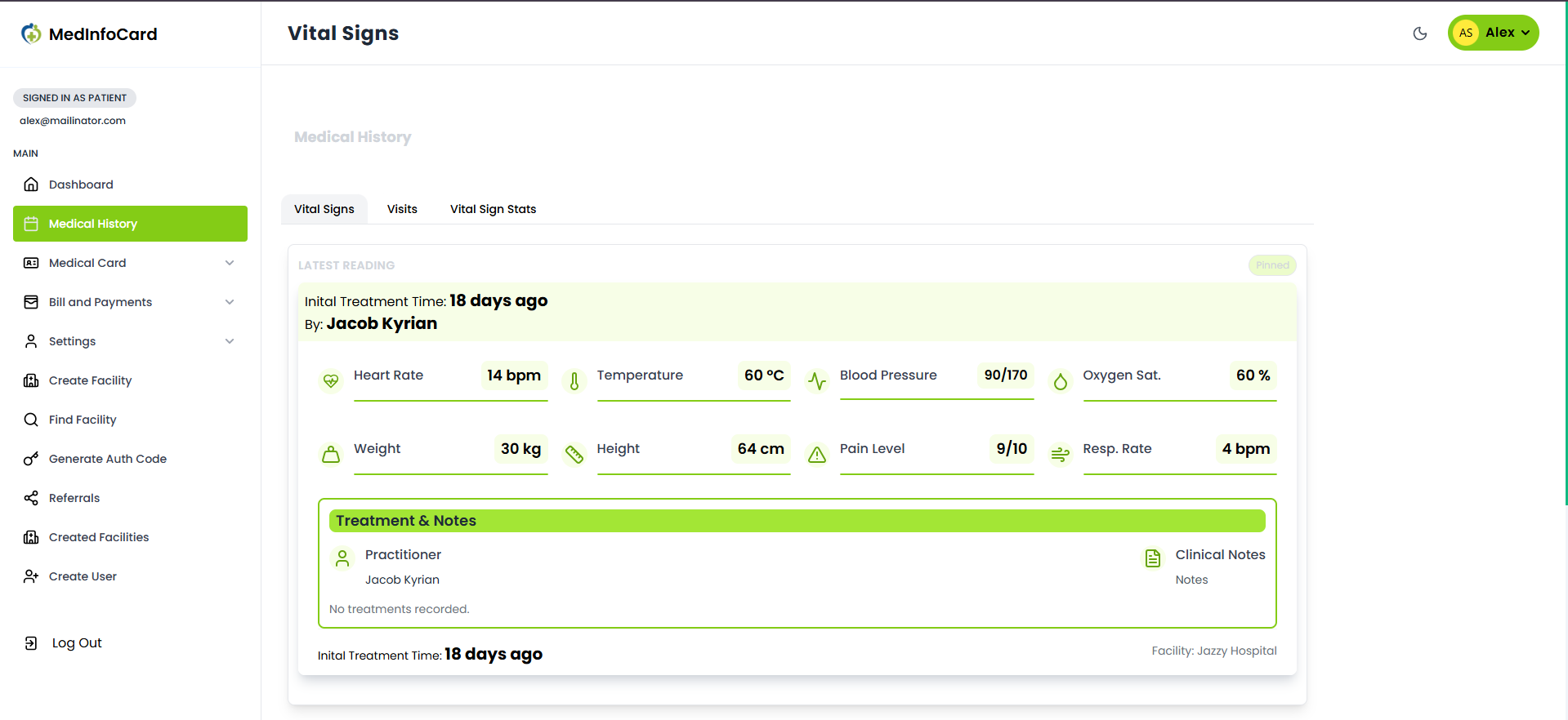 Verified hospitals/clinics can securely add: Vital signs (blood pressure, heart rate, oxygen levels), Diagnosis & treatment notes, Prescriptions & lab orders All updates are timestamped and auditable.